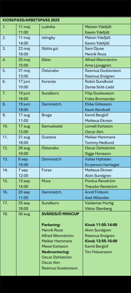 Hej! Om alla föranmälda kommer så blir vi cirka 140 spelare som kommer att fotas på tisdag. Så himla KUL att vi är så många som vill fotas och få snygga bilder på våra lag! När: Tisdag den 26 augusti (se tidsschema nedan) Var: Svärdsjö gymnastiksal. Obligatorisk klädsel spelare: Svärdsjö IF matchtröja (lånas på plats), blå shorts + blå strumpor, fotbollsskor (ledare pratar ihop er så ni har samma kläder, matchtröjor i vuxenstorlek kan lånas på plats). Ta med: Utskriven och signerad beställningsblankett. Beställningsblanketten hittas på klubbsidan under Mer/Dokument/Beställningsblankett 2025. Det kommer även från ikväll (ons 20/8) finnas utskrivna blanketter inne på soffbordet på Klubbis som vi kan dela ut. Policy fotografering: * Svärdsjö IF respekterar alla barns rätt till integritet. Ingen ska synas på bild eller film mot sin vilja. * Barn med skyddad identitet får aldrig förekomma i publicerat material. * Föreningen får ta och använda bilder i informations- och marknadsföringssyfte (t.ex. på hemsida och sociala medier) endast om samtycke har lämnats av vårdnadshavare. * Vid organiserade fotograferingar (t.ex. lagfoto) informeras vårdnadshavare i förväg och ges möjlighet att tacka nej till att barnet medverkar. * Det är vårdnadshavares ansvar att informera om barnet har skyddad identitet – föreningen behandlar den informationen med största sekretess. Listor över barn med fotoförbud hanteras endast av ordförande och lagets ledare. * Det är inte tillåtet att publicera bilder på andra barn än sina egna i sociala medier utan samtycke. Tiderna på schemat är tiden då fotograferingen startar, vi samlas ca 30 min innan så vi kan se till att spelarna är ombytta och klara i god tid innan fotograferingen startar. Fotoschema: 16:45-17:25 F 13/14/15/16 17:25-18:05 PF 19/20 18:05-18:55 PF 16/17/18 18:55-19:35 P 15/16 19:35-20:25 P 13/14 Info till vårdnadshavare: * Alla spelare (som vill) fotograferas både på lagbild och individuellt. * Ingen behöver köpa någonting – och ni behöver inte göra någonting om ni inte vill beställa. Inga bilder skickas ut om ni inte beställer. * Men om ni är intresserade av att köpa bilder så fyller ni i beställningsformuläret och lämnar detta till ledarna. Glöm inte att kryssa i önskade alternativ. Då får ni sedan de önskade bilderna för påseende. * Om ni sedan inte vill köpa bilderna står ni själva för returporto. * Priserna hittar ni på beställningsblanketten. * Inga föräldrar i hallen under fotograferingen. Bara hör av er vid ev frågor! :)